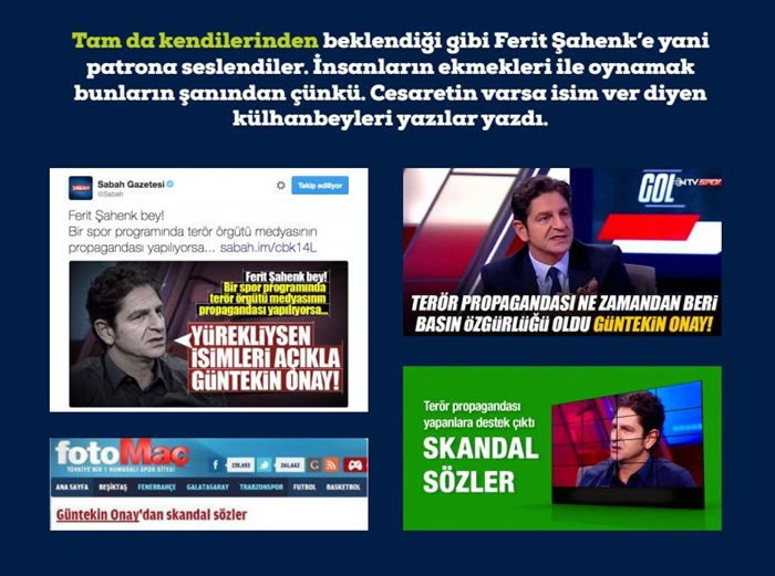 Tahmin edileceği gibi İslamcılar köylülüklerini ve vicdansızlıklarını göstermekte vakit kaybetmediler. Güntekin’e yönelik linç ve hakaretler peşi sıra gelmeye başladı. Güntekin’i terör propagandası yapmakla suçladılar. Tam da kendilerinden beklendiği gibi Ferit Şahenk’e yani patrona seslendiler. İnsanların ekmekleri ile oynamak bunların şanından çünkü. Cesaretin varsa isim ver diyen külhanbeyleri yazılar yazdı.