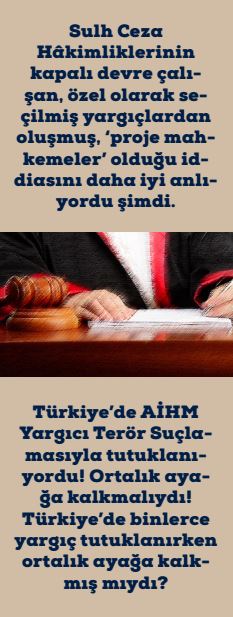 Ve Sulh Ceza Yargıcı kararını açıkladı: Kuvvetli suç şüphesinin varlığı, kaçma şüphesi, delilleri karartma tehlikesi olduğundan şüphelinin tutuklanmasına… Kararda herhangi bir gerekçe yoktu. Olması da mümkün değildi. Türkiye’ de AİHM Yargıcı Terör Suçlamasıyla tutuklanıyordu! Ortalık ayağa kalkmalıydı! Türkiye’de binlerce yargıç tutuklanırken ortalık ayağa kalkmış mıydı? Eşiyle birlikte Antalya uçağında olması gereken saatte, elinde kelepçe AİHM yargıcı Richard C., cezaevi yolundaydı. Avukatının tutuklama kararına yapmış olduğu itiraz da yine hiçbir gerekçe gösterilmeden reddedildiğini öğrendi. Sulh Ceza Hâkimliklerinin kapalı devre çalışan, özel olarak seçilmiş yargıçlardan oluşmuş, ‘proje mahkemeler’ olduğu iddiasını daha iyi anlıyordu şimdi. Oysa daha birkaç gün öncesine kadar bu iddialar kendisine biraz abartılı geliyordu.