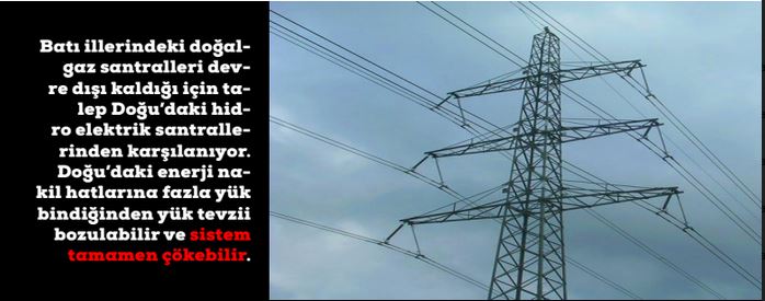 Elektrik Mühendisleri Odası ufuktaki başka bir krize dikkat çekti. Büyük ölçekli doğalgaz santralleri daha ziyade batı illerinde. Bunlar devre dışı kaldığı için elektrik talebi Doğu’daki hidro elektrik santrallerinden karşılanıyor. Bu esnada Doğu’daki enerji nakil hatlarına fazla yük bindiğinden yük tevzii bozulabilir ve sistem 31 Mart 2015’te olduğu gibi tamamen çökebilir.