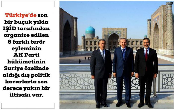 Diğer taraftan, Türkiye’nin muhtelif şehirlerinde son bir buçuk yılda IŞID tarafından organize edilen 6 farklı terör eyleminin AK Parti hükümetinin özellikle Suriye özelinde aldığı dış politik kararlarla da son derece yakın bir iltisakı var. Türkiye an itibariyle Suriye’de son üç yıldır ‘’öfkeli Sunni gençler bunlar’’ dediği, yer yer müsamaha gösterdiği, ve Can Dündar gibi isimlere göre daha önce beraber çalıştığı IŞID ile mücadele etmekte. Geçtiğimiz haftalarda bu mücadele devam ederken 16 askerimiz El-Bab’ta şehit edildi ve IŞID tarafından yakalanan iki askerimiz canlı canlı ateşe verilerek yakıldı. Daha kaygı verici olan durum ise şu ki, 3 Ocak’ta İngiliz Independent gazetesine konuşan IŞID’a yakın bir kaynak, yılbaşı gecesi Istanbul Reina’da meydana gelen terör saldırısına benzer saldırıların artarak devam edeceğini, ve IŞID kadrolarının Suriye’de yaşananlardan ötürü Türkiye’ye karşı son derece kin ve nefretle dolu olduklarını belirtti.