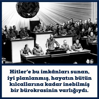 Hitler’e bu imkânları sunan, iyi planlanmış, hayatın bütün kılcallarına kadar inebilmiş bir bürokrasinin varlığıydı. Partiyle bürokrasiyi bütünleştirip, en küçük nahiyeye kadar devlet propagandasını ulaştırabildiğinde, hayatın tek hâkimi olmuştu. Totaliter rejimler, böyleydi. Osmanlı’da çoğu dönemde, bu türlü bir hâkimiyet mümkün olamazdı. Abdülhamit’e ‘müstebit’ (baskıcı) olmayı sağlayan, Tanzimat’ın ilânının Osmanlı’ya getirdiği bürokrasi aygıtının ‘gücü’ ve kendi döneminde topluma kazandırdığı ‘yenilikler’di.