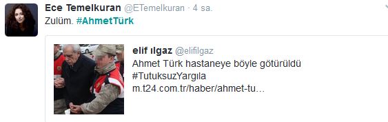 Mardin Başsavcılığı’nın yürüttüğü soruşturmada tutuklanan Ahmet Türk’ün, Elazığ’da ellerinin kelepçelenmesi ve iki koluna girilerek hastaneye götürülmesi tepki çekti. Ece Temelkuran’ın ‘Zulüm’ diye paylaştığı görüntü için, Tarık Toros, Twitter hesabından ”Uzun uzun baktım bu fotoğrafa. Halen etkisindeyim, kalbim şöyle bağırıyor: Ey Türk Milleti olacakları hak ediyorsun!” diye not düştü.