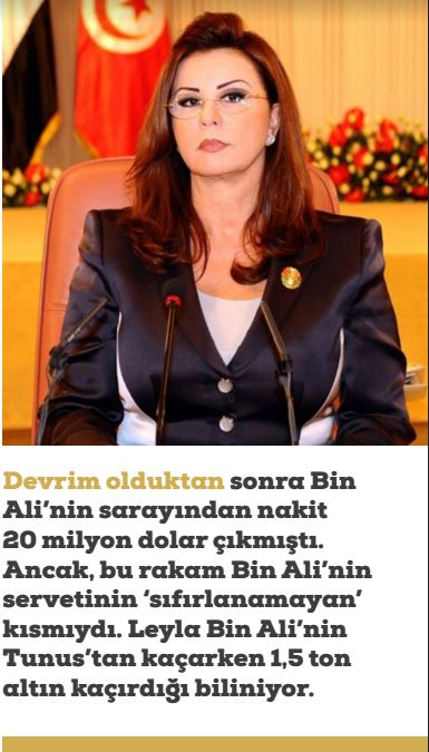 Bin Ali’nin ülkeyi terk etmesinin ardından Tunus yargısı özel bir heyet kurarak ailenin mülk ve hesaplarına el koymaya başladı. Devrim olduktan sonra Bin Ali’nin sarayından nakit 20 milyon dolar çıkmıştı. Ancak, bu rakam Bin Ali’nin servetinin ‘sıfırlanamayan’ kısmıydı. Zira, aile servetin büyük bir çoğunluğunu devrim esnasında yurtdışına kaçırdı. Leyla Bin Ali’nin Tunus’tan kaçarken 1,5 ton altın kaçırdığı biliniyor.