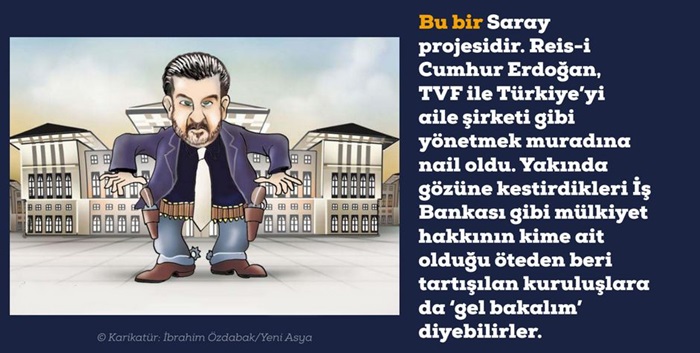 Bu bir Saray projesidir. Reis-i Cumhur Recep Tayyip Erdoğan, TVF ile Türkiye’yi aile şirketi gibi yönetmek muradına nail oldu. Yakında gözüne kestirdikleri İş Bankası gibi mülkiyet hakkının kime ait olduğu öteden beri tartışılan kuruluşlara da ‘gel bakalım’ diyebilirler. Fona geçecek şirketlerin ille de Hazine ile iltisaklı çıkması şart değil. KHK ile evvela kayyım atanır, akabinde TMSF’ye, nihayetinde Türkiye Varlık Fonu’na devrolunur. Hukuk ilga edilmişse işte bu kadar basit. Türkiye’de artık hiçbir banka, şirket, grup veya holdingin teminatı yok. TMSF üzerinden yapılamayan işlemler için TVF devreye girdi bile.