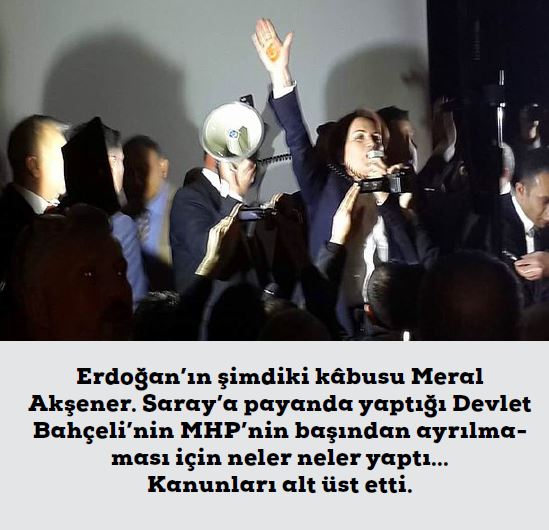 Erdoğan’ın şimdiki kâbusu Meral Akşener. Saray’a payanda yaptığı Devlet Bahçeli’nin MHP’nin başından ayrılmaması için neler neler yaptı… Kanunları alt üst etti. Saçma sapan mahkeme kararları aldırdı. Delegelerin çoğunluk oylarını heba etti. Kongre salonunu tutturmadı. Akla gelen her illegal hamleyi pervasızca yaptı, yaptırdı. Bahçeli’yi MHP seçmeni ve delegesine rağmen partinin başında tutması korkularının azalttı mı? Azaltmadı. Şimdi Akşener’in küçük otel toplantılarını bile sabote ettiriyor.