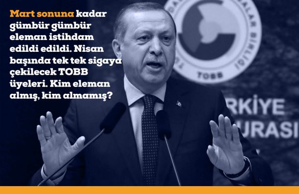 Mart sonuna kadar gümbür gümbür eleman istihdam edildi edildi. Nisan başında tek tek sigaya çekilecek TOBB üyeleri. Kim eleman almış, kim almamış? İşsizlik Fonu’nda çalışanlardan kesilen paralarla 90 milyar TL birikti. Nasıl ‘yandaş’ patronların kredi krizine ‘Paralel Hazine’ kurarak çare bulundu ise gümbür gümbür istihdama da İşsizlik Fonu’ndan destek verilir olur biter. İtiraz edenlere KHK kadife eldiveni ile haddi bildirilir. Gümbür gümbür istihdamın senelik 12,5 milyar TL maliyeti var. 11 milyar lirası İşsizlik Fonu’ndan alınınca mevzu çözülmüş sayılır.