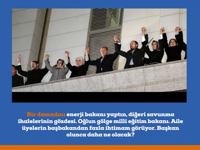 Bir damadını enerji bakanı yaptın, diğeri savunma ihalelerinin gözdesi. Oğlun gölge milli eğitim bakanı. Aile üyelerin başbakandan fazla ihtimam görüyor. Başkan olunca daha ne olacak?
