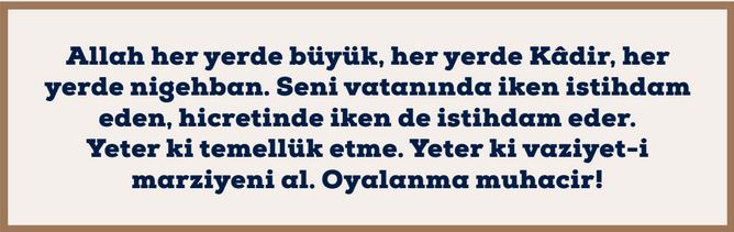Biri korku. Ya yapamazsam endişesi. Bu Hizmetin önden giden atlıları, gittikleri ülkelerde kalacak bir adres bile bilmeden yollara koyuldular. Aczimiz, ilahi dergahta şefaatçimiz oldu. ‘Bu gurbet şartlarında yapamam’ diyen, ‘Vatanımdayken ben yapmıştım’ şirk-i hafisini ima ettiğini bilmeli. Allah her yerde büyük, her yerde Kâdir, her yerde nigehban. Seni vatanında iken istihdam eden, hicretinde iken de istihdam eder. Yeter ki temellük etme. Yeter ki vaziyet-i marziyeni al. Oyalanma muhacir!