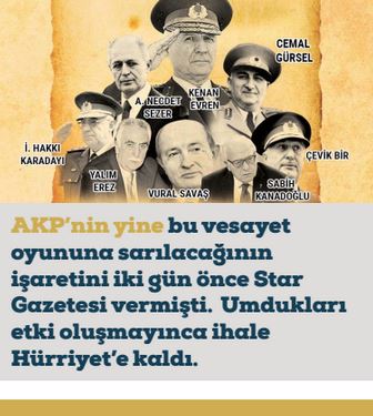 ‘Karargâh Rahatsız’ manşetine gelmeden, AKP’nin yine bu vesayet oyununa sarılacağının işaretini iki gün önce Star Gazetesi vermişti. AKP’lilerin şuuraltındaki bütün öcülerin fotoğrafını kolajlayıp ‘vesayet pusuda’ diye manşet attılar. Vural Savaş’tan Ahmet Necdet Sezer’e ve Çevik Bir’den Kenan Evren’e kadar bütün ‘nefret objeleri’ bir aradaydı. Umdukları etki oluşmayınca ihale Hürriyet’e kaldı.