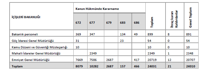 OHAL kapsamında çıkarılan 5 KHK kapsamında (672, 677, 679, 683, 686 sayılı) İçişleri Bakanlığı’ndan çoğu emniyet personeli olmak üzere 24 bin 31 kamu çalışanı ihraç edildi.  Mahalli İdareler Genel Müdürlüğü’nden 2 bin 348, bakanlık personelinden 891 kişi kamuda işinden oldu. Ayrıca emekli olmuş 1140 emniyet mensubunun silah, ünvan, ruhsat, kamuda çalışma hakkı gibi temel hakları gerekçesiz şekilde elinden alındı.