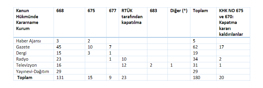 20 Temmuz 2016-6 Ocak 2017 tarihleri arasında 178 medya kuruluşu kapatıldı. Bu kuruluşların 20’sinin (çoğu yerel basın) kapatma kararı kaldırıldı. Kapalı kuruluş sayısı halen 158. Basın yayın kuruluşlarının kapatma kararları hükümet ve organları eliyle (668, 675, 677, 683 sayılı KHK’lar ve RTÜK) alındı.