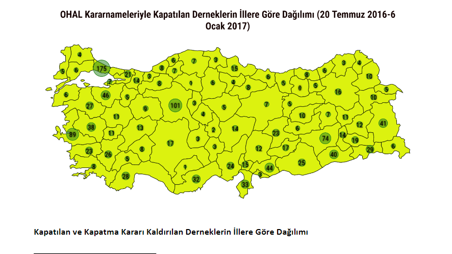23 Temmuz 2016 tarihli 667 sayılı KHK ile 1125, 677 sayılı KHK ile 375, 679 sayılı KHK ile 83 olmak üzere toplam 1583 dernek ve sivil toplum kuruluşu kapatıldı, kapısına kilit vuruldu. 182’sinin geri açılmasına izin verilmesine karşın 1401 dernek halen kapalı.