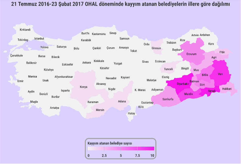 15 Şubat 2016 tarihli 674 sayılı KHK ile Belediye Kanunu’nda değişiklik yapılarak ‘terör örgütleriyle ilişkisi tespit edilmesi durumunda’ belediyelerin merkezi hükümete devredilmesi yetkisi verildi. 23 Şubat 2017’ye kadar 80 belediyeye kayyım atandı.
