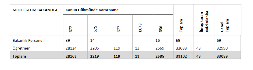 Milli Eğitim Bakanlığı 6 ayrı kararname ile 33 bin 99 öğretmen ve idari personel hakkında ihraç kararı verdi.  Kamuda hizmet veren eğitimcilerin  28 bin 163’ü 672 sayılı KHK ile görevden alınırken, 675, 677, 679 ve 686 sayılı KHK’lar birlikte 32 bin 990’u öğretmen, 69’u idari personel ihraç edilmiş oldu. Özel öğretim kurumlarında çalışan 22 bin 474 öğretmen, uzman ve yönetici dahil edildiğinde eğitimdeki büyük tasfiyenin rakamları 55 bini aştı. Buna ek olarak, kapatılan dershaneler ve etüd-eğitim merkezlerinden dolayı işlerini kaybeden onbinlerce eğitimci ve çalışan yer alıyor.
