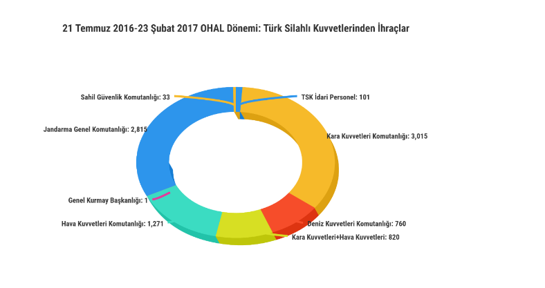 20 Temmuz 2016-17 Şubat 2017 arasında çıkarılan 8 ayrı KHK ile 8 bin 775 TSK mensubunun ihracı gerçekleştirildi. İhraç kararı alınan personelin 3 bin 15’i Kara Kuvvetleri Komutanlığı, 2 bin 815’i jandarma,  1271 Hava Kuvvetleri Komutanlığı, 760’ı Deniz Kuvvetleri komutanlığı personeliydi.  Darbenin merkez üssü denilen Genelkurmay Başkanlığı personelinden sadece 1 kişi ihraç edildi.  İhraç edilenlerin darbe ile irtibatlarına dair somut yargı kararları, idari soruşturma sonuçları henüz ortaya çıkmadı.