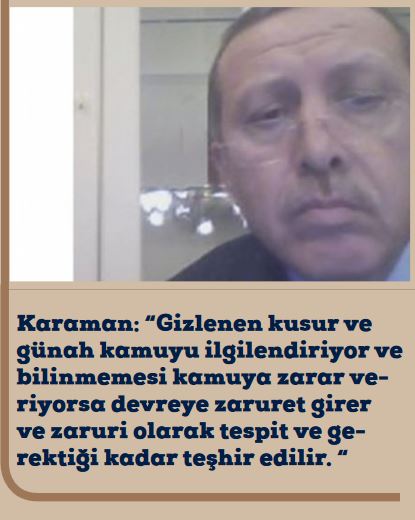 “Gizlenen kusur ve günah kamuyu ilgilendiriyor ve bilinmemesi kamuya zarar veriyorsa devreye zaruret girer ve zaruri olarak tespit ve gerektiği kadar teşhir edilir. Ülkemizde ve dünyada zaman zaman gizlilikler ortaya çıkarılıyor, rezaletler teşhir ediliyor. Bu teşhirler yukarıda açıklanan kurala uygun ise denecek bir şey yoktur.” (12 Mayıs 2011’de Yeni Şafak’ta yayınlanan “Günah kasetleri ve teşhiri” yazısının başlığı bile hüküm veren ve yargı içeren bir dili işaret ediyor.)