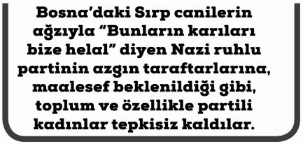 Her felakette olduğu gibi, Türkiye’deki soykırım ikliminin en mağdurları da yine kadınlar oluyor. Bosna’daki Sırp canilerin ağzıyla “Bunların karıları bize helal’ diyen Nazi ruhlu partinin azgın taraftarlarına, maalesef beklenildiği gibi, toplum ve özellikle partili kadınlar tepkisiz kaldılar. Eşleri bu soykırım ikliminde suçsuz olduğu halde tutuklanan kadınlar, (eşlerinin bir suçu olsa bile) suçun şahsiliği prensibi umursanmadan işlerinden atıldılar. Hâkimlik, doktorluk, hemşirelik, öğretmenlik, yöneticilik gibi kolay elde edilemeyen nitelikli işler yapmalarına bakılmadı. Sigorta kayıtlarına düşülen hukuksuz şerhlerle yeni bir işe girmeleri engellendi. Çocuklarının geçimini sağlamak için talip oldukları zor işlere dahi aşağılanarak kabul edilmediler.