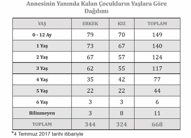 Özelikle 15 Temmuz sonrası OHAL kapsamında anneleri cadı avına maruz kalan yüzlerce bebek ve çocuklar, cezaevinde kalmak zorunda bırakılıyor. Son 3 ayda dört duvara girmek zorunda kalan çocuk sayısı 108 oldu. Toplamda ise cezaevindeki çocuk sayısı 668 ulaştı. Bunların içinde 1 yaşın altındaki çocuk sayısı ise 149’a çıktı,