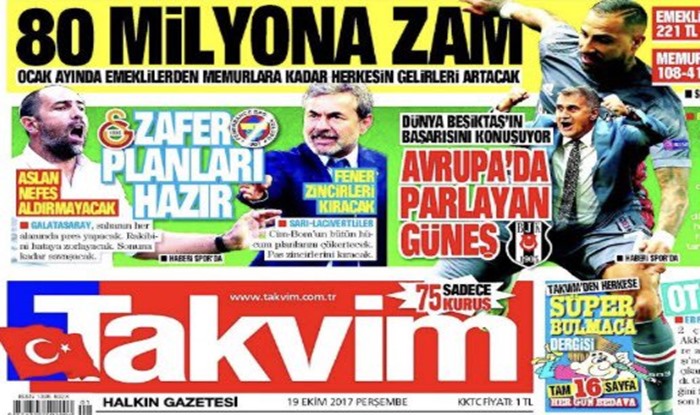 AKP Hükümeti, artan vergi oranları ve gerçekleşen zamlarla milyarlarca liralık bütçe açığını vatandaşın üzerinden kapatmaya çalışırken havuz medyası mutlu tablo haberleri yapmaya devam ediyor. Daha önce 10 gün içinde emeklilere hergün birbirinden farklı zam haberlerin ile çıkan Takvim Gazetesi bu sefer hızını alamayarak 80 milyona zam haberiyle çıktı. Bugünkü sürmanşetteki başlık ’80 milyona zam’ oldu. Gazetenin haberine göre, önümüzdeki Ocak ayından itibaren emeklilerden memurlara kadar herkesin gelirleri artacak.