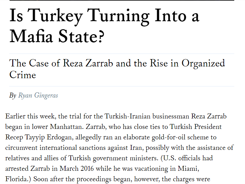 Foreign Affairs’de Ryan Gingeras tarafından kaleme alınan makalede, Türkiye Cumhurbaşkanı Recep Tayyip Erdoğan’la sıkı ilişkileri olan Zarrab’ın, İran’a yönelik uluslararası yaptırımlardan kaçınmak için, büyük ihtimalle de Türk hükümeti bakanlarının akrabaları ve ittifaklarının yardımıyla, özenle hazırlanmış petrolü altına dönüştürme düzenini yönettiği iddiası (ABD yetkilileri Zarrab’ı Mart 2016’da, Miami, Florida’da tatildeyken tutuklamıştı) aktarılıyor.