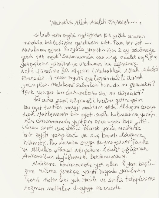 Her Cuma günü alışkanlık haline getirdiğimiz bu ayet twitter mesajı mahkum oldu. Aldığım cezaya değil, mahkemenin bir ayeti suç bulmasına yanıyorum. Savunmamda yaptığım onca uyarı boşa gitti. Savcı ayeti suç delili olarak yazdı, mahkeme bir ayeti yargıladı ve suçkanıtı olduğuna hükmetti. Bu karara saygı duymuyorum. Tarihe ve Allah’a şikayet ediyorum. Adalet çığlığımın Ankara’dan duyulmasını beklemiyorum.